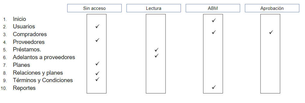 Los rojos asociados a la operatoria de lending: Proveedores/Comercios, Compradores/Clientes, Planes y Relaciones/Condiciones comerciales, Reglas de otorgamiento.