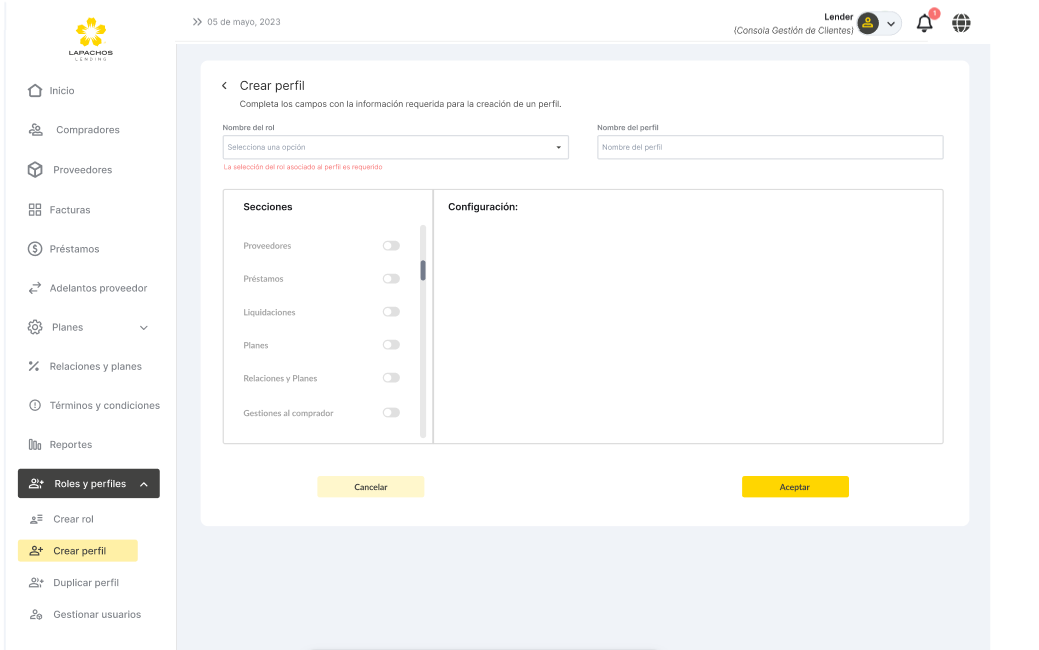 La selección del tipo de lending impactará en los módulos que definirán entidades, validaciones, reglas de negocio, flujos y demás aspectos operativos a aplicar. Es decir, esperamos que luego los módulos tengan diferentes reglas de negocio y flujos operativos de acuerdo al modelo de negocio seleccionado.