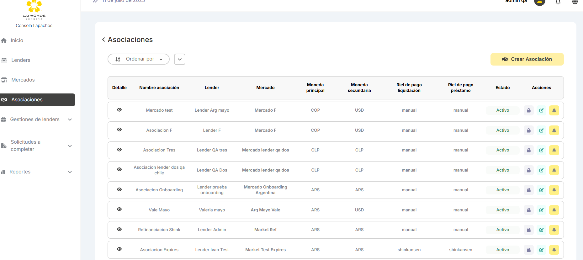 Módulo Asociación (relaciona a los del Lender + Mercado + Modulo de Negocio)