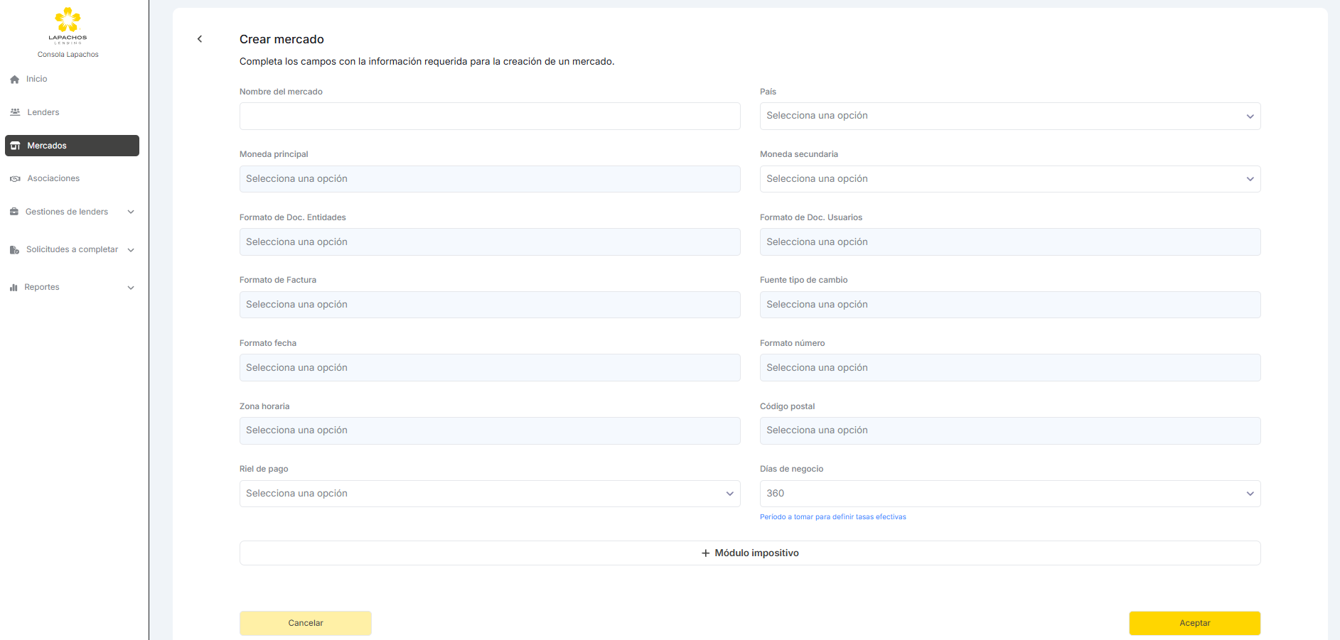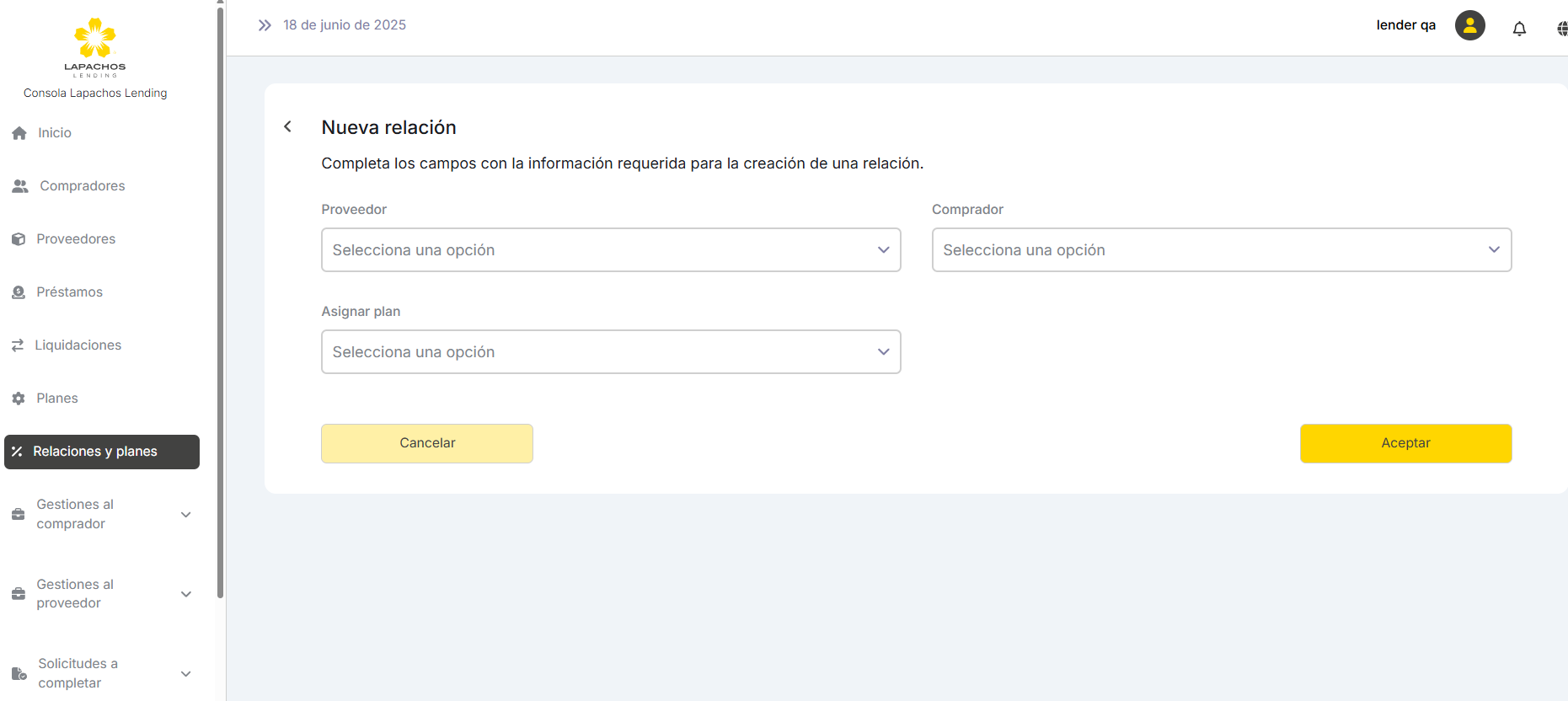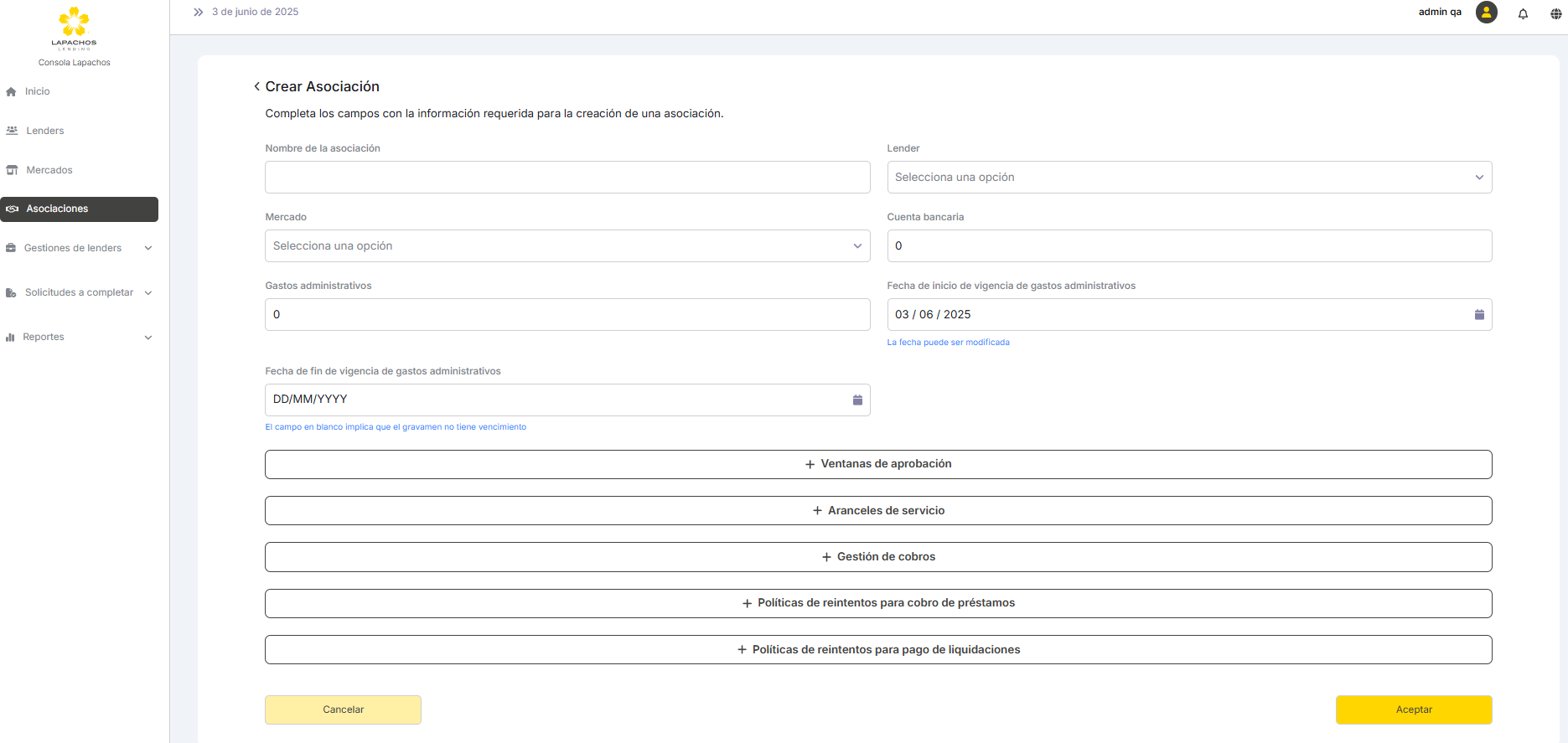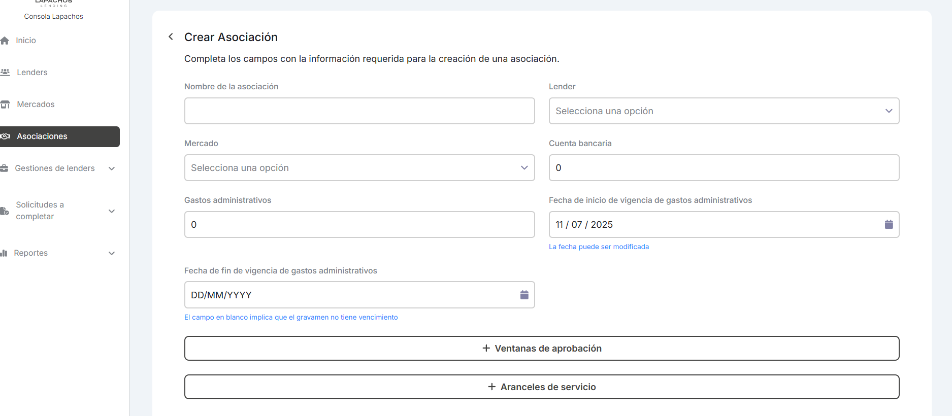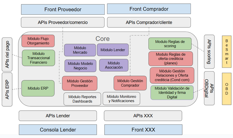 Modulo Asociaciones: Permite unir los tres anteriores para la definición del ecosistema donde operara el Lender, el Comprador y el Proveedor/Comercio