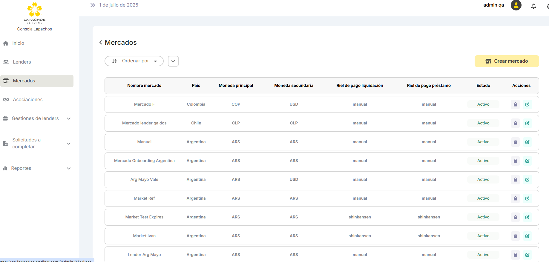 El Comercio debe estar en estado activo en la asociación Lender/Mercado/Modelo de negocio