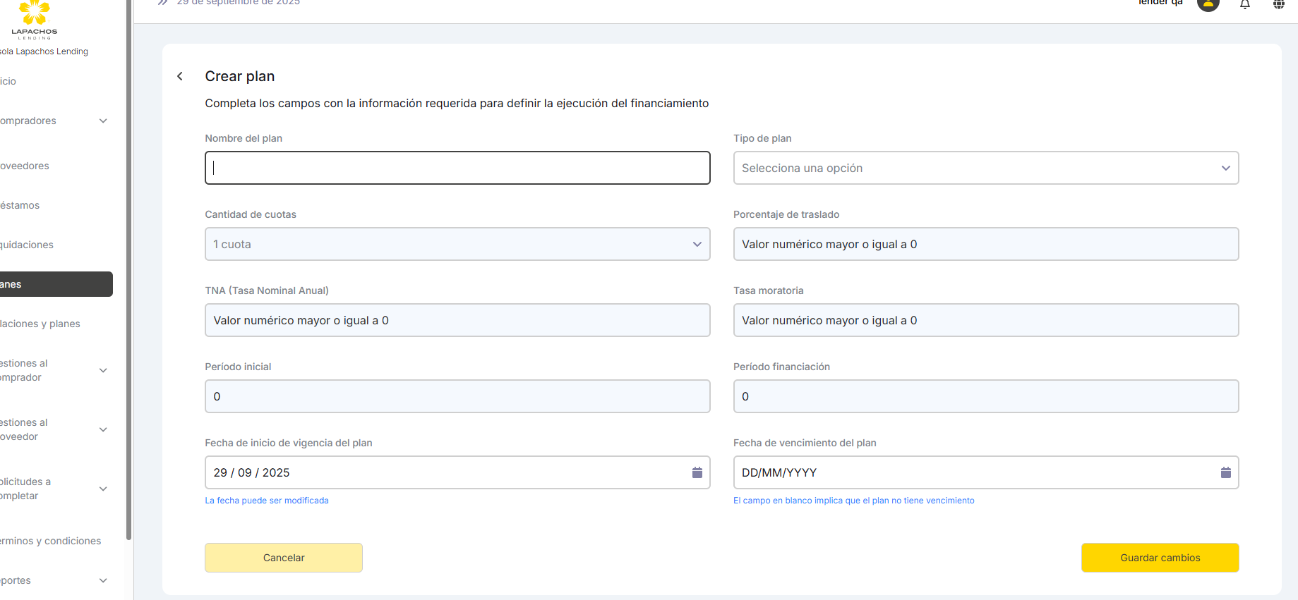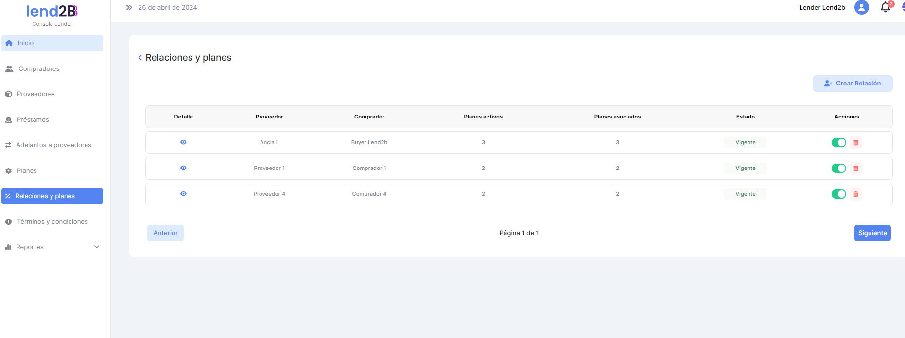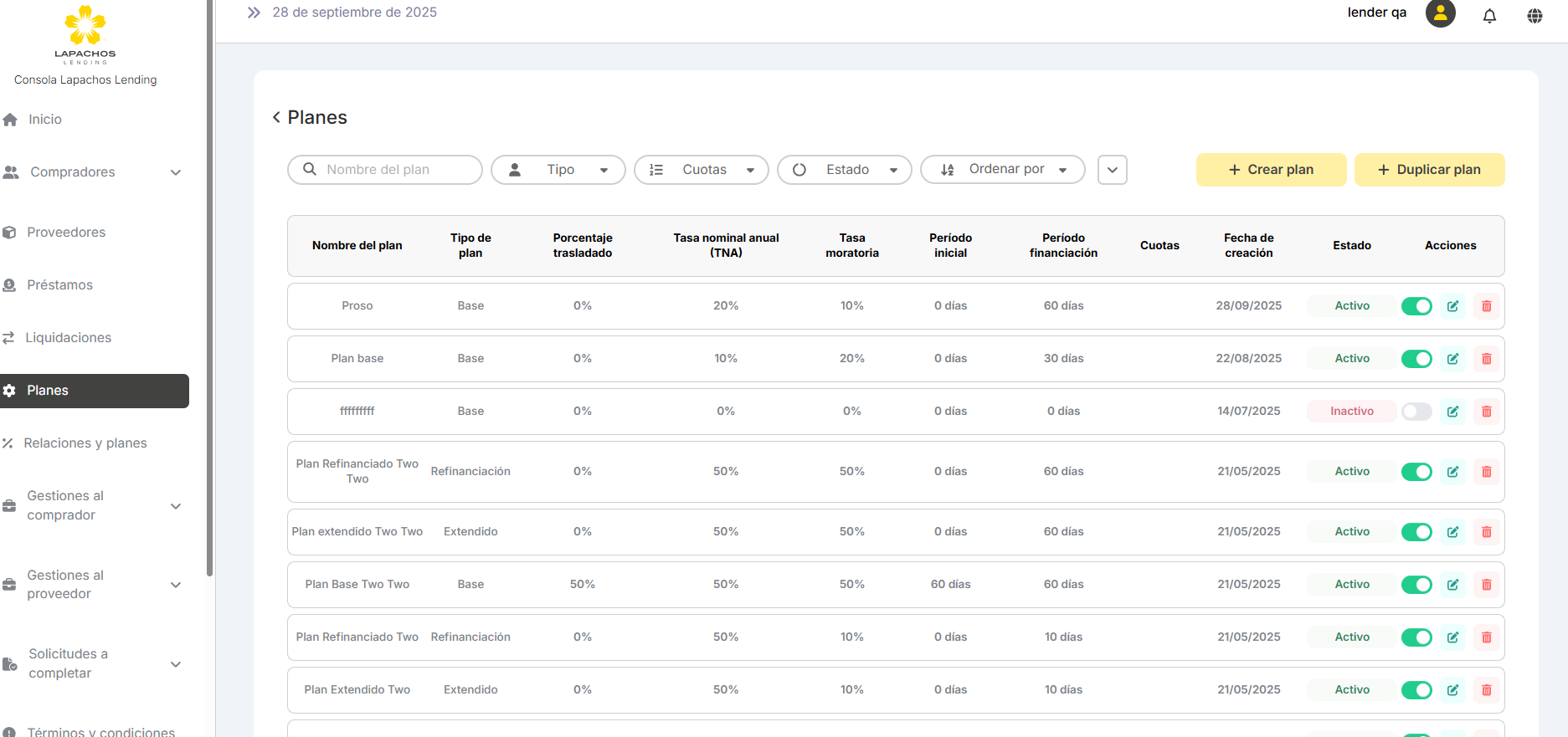 Detalle de todos los Planes en estado activo habilitados por el Lender: