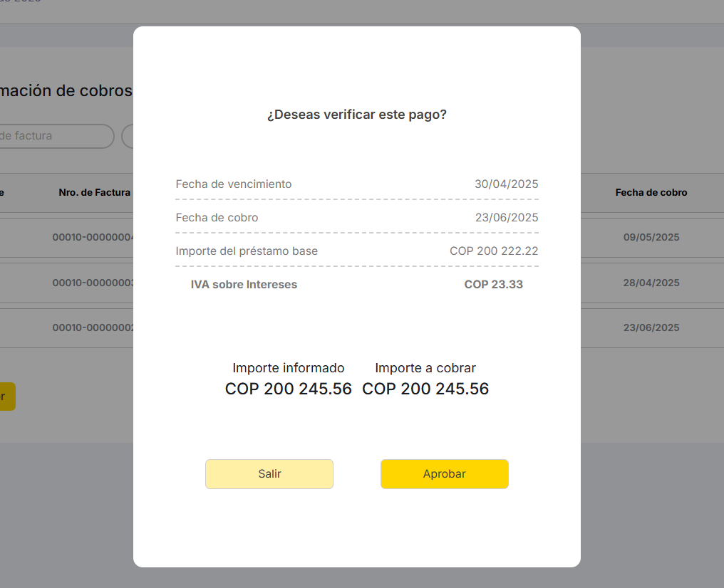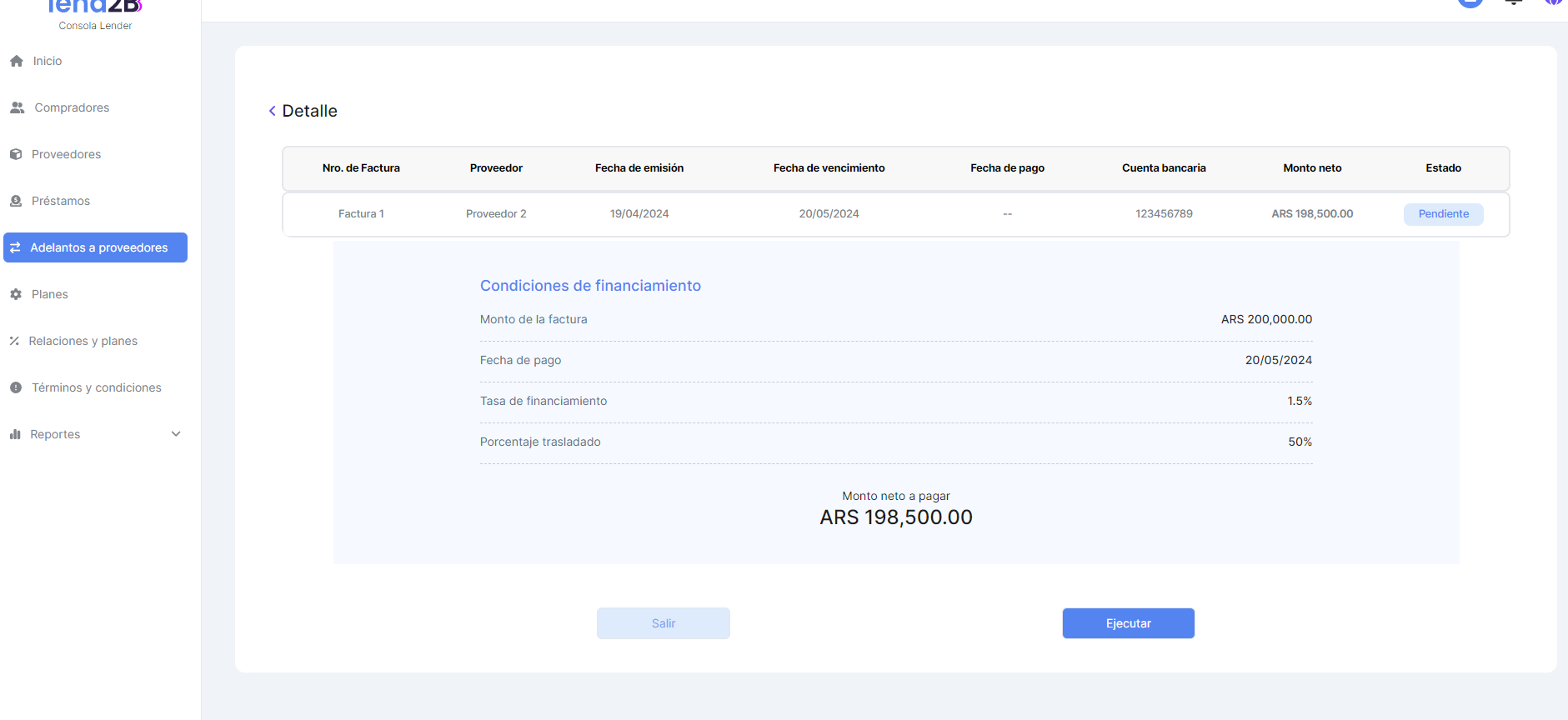 Por otro lado, en la Consola del Comercio se debe mostrar un modal que informe que el Préstamo ha sigo otorgado con éxito detallando los datos del mismo