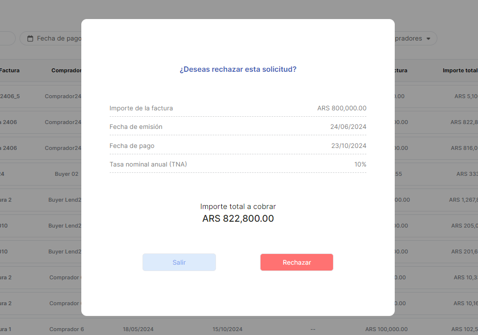 Por otro lado, en la Consola del Comercio se debe mostrar un modal similar al siguiente: