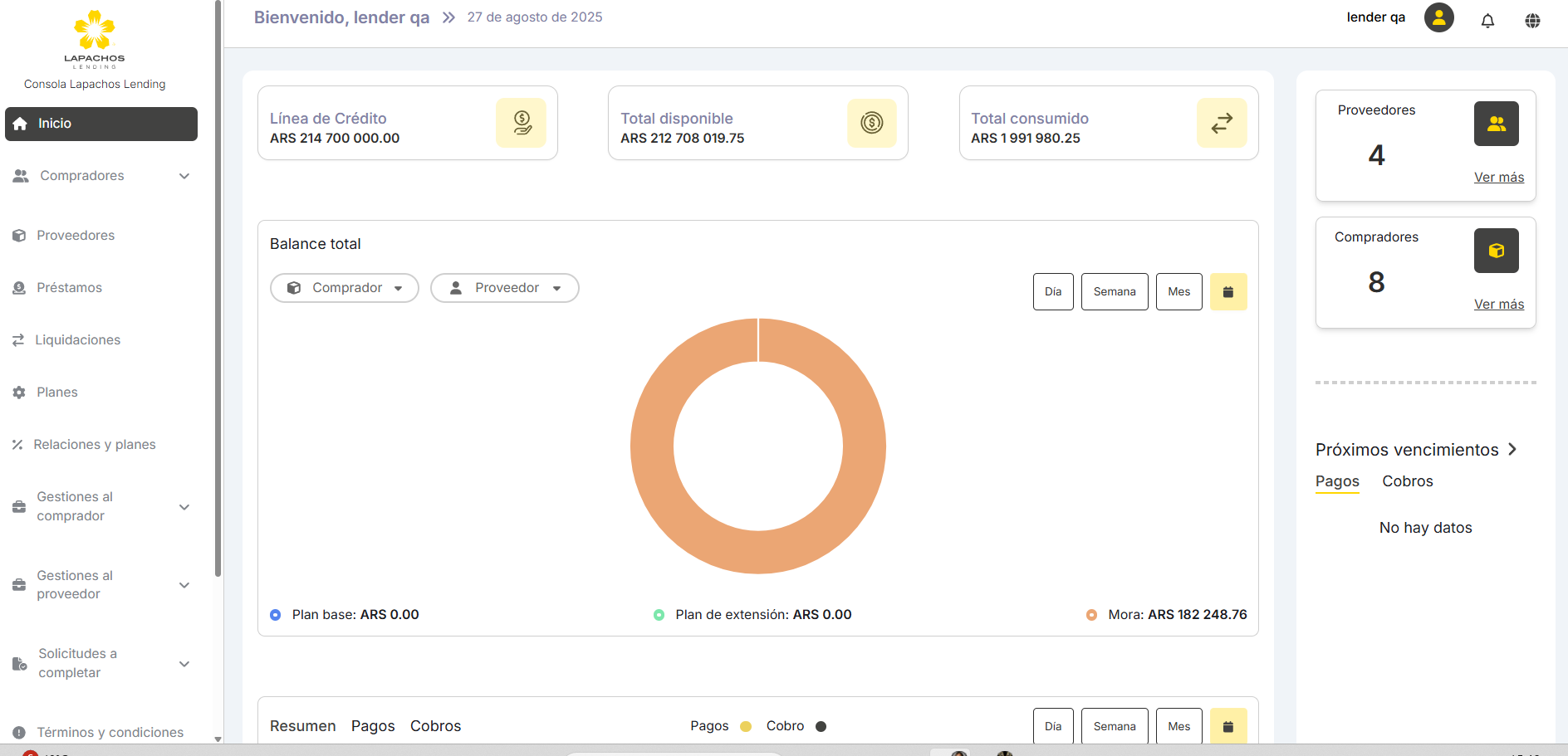 Al acceder a su Consola el Lender en el Modelo de negocio B2C Consumo, se debe mostrar la pagina actual con el siguiente menú: