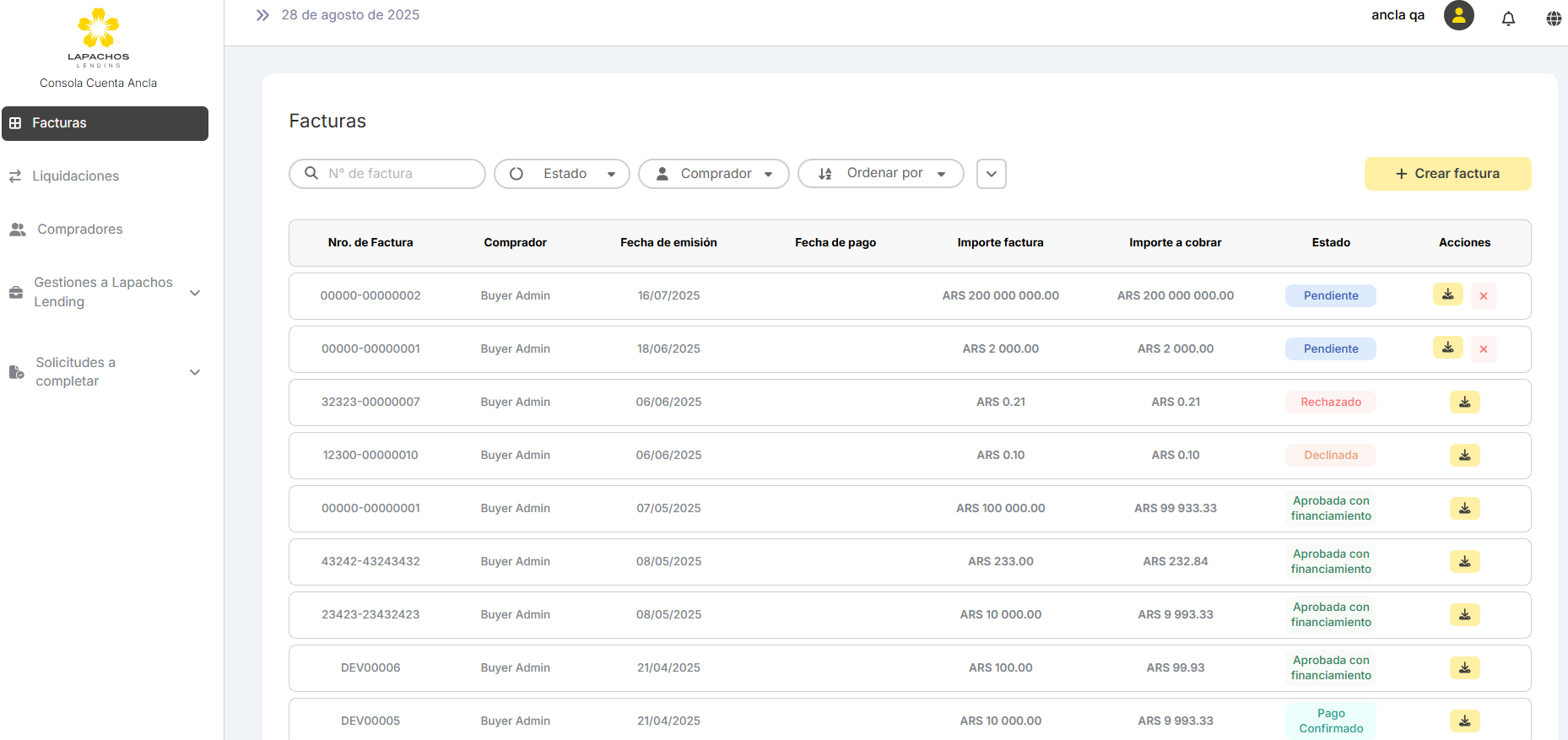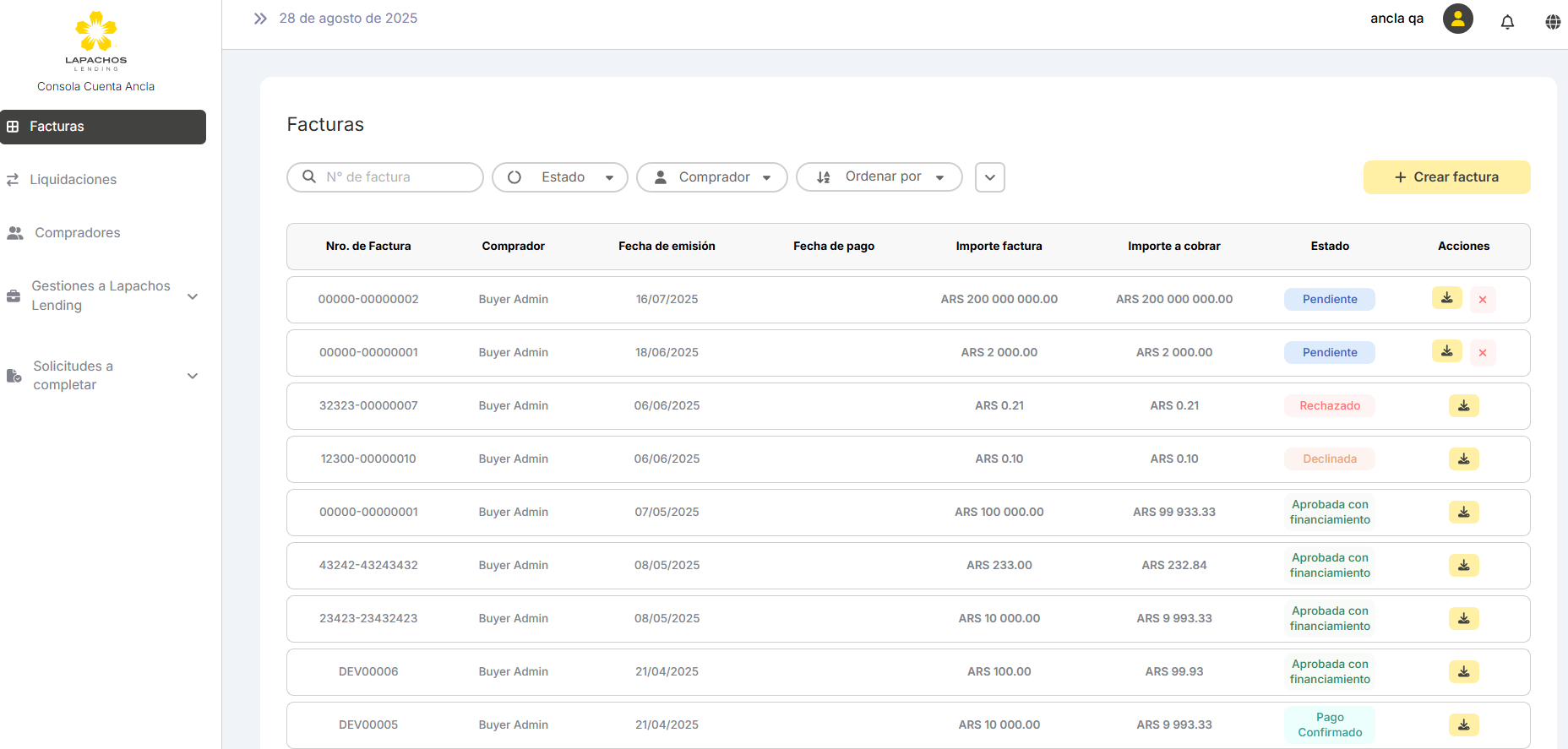 Al seleccionar Clientes se debe acceder a una pantalla similar a la de Facturas en la Consola del Comprador del Modelo B2B WC.