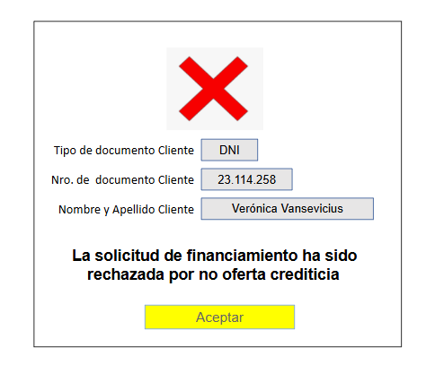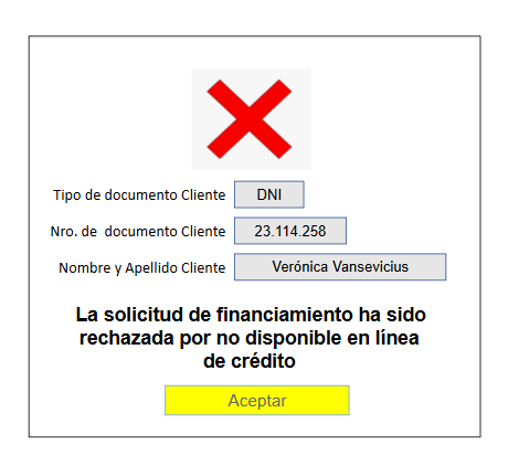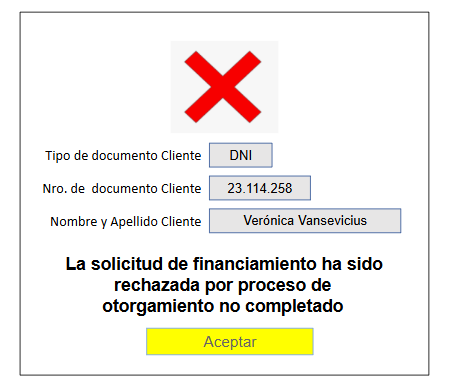 → Si el Cliente no logra validar su identidad o no acepta las condiciones + T&C del financiamiento la solicitud de financiamiento debe ser rechazada.
