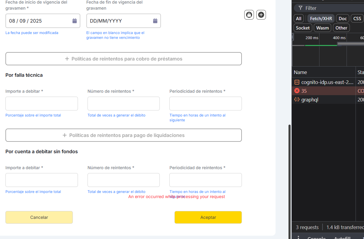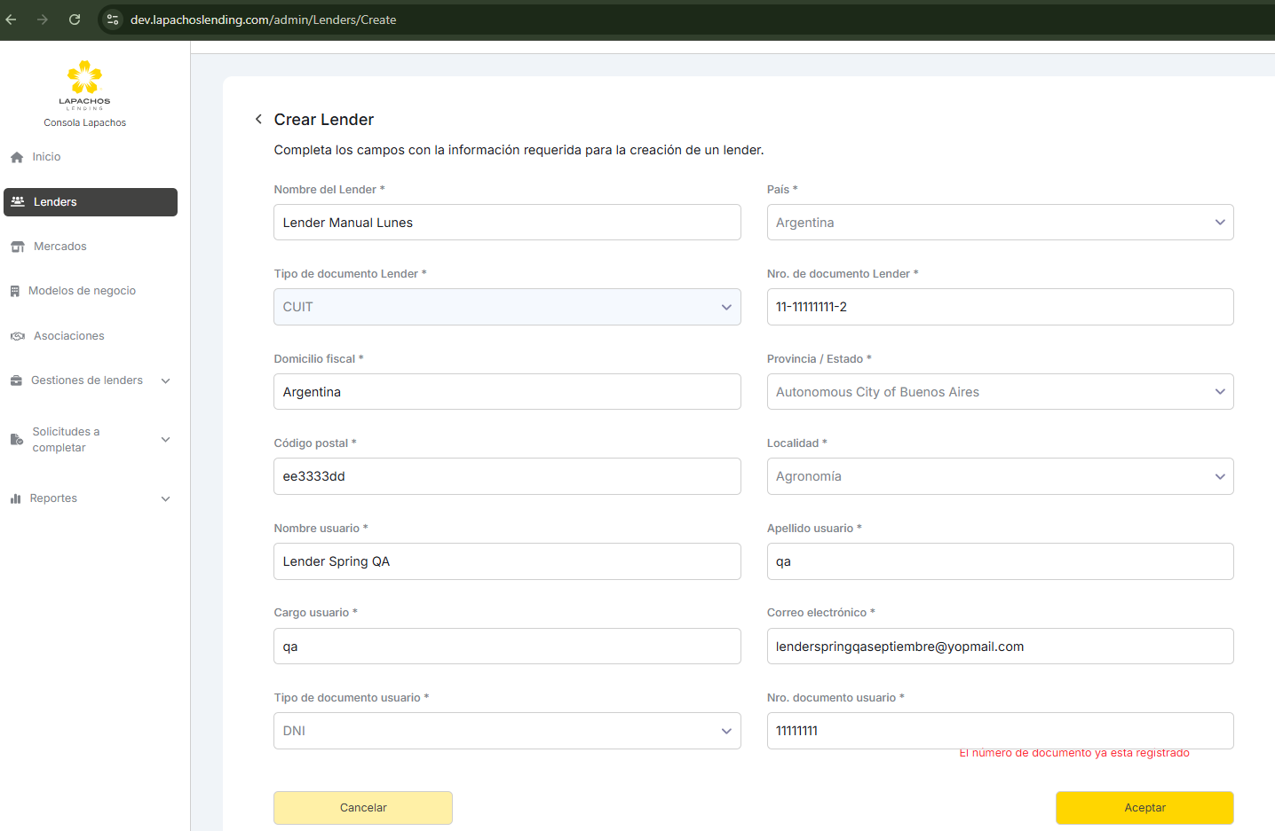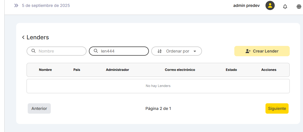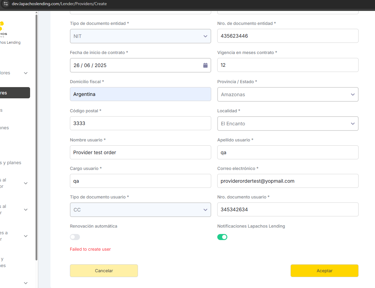 Error al crear lender