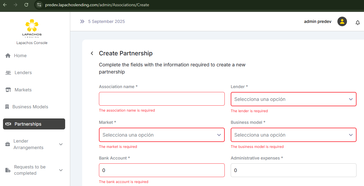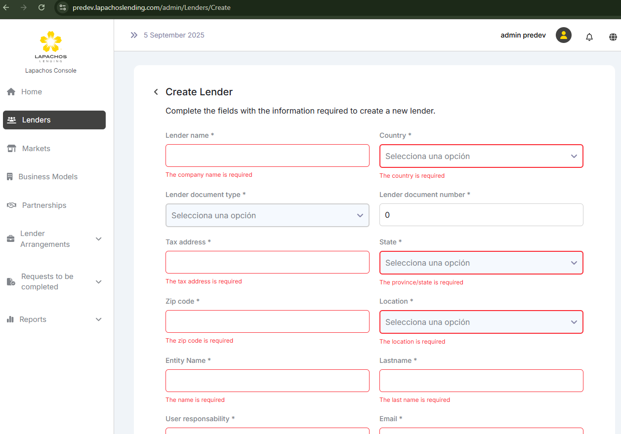 En el formulario de crear lender, el idioma esta en ingles y hay palabras en español como “Selecciona una opción“