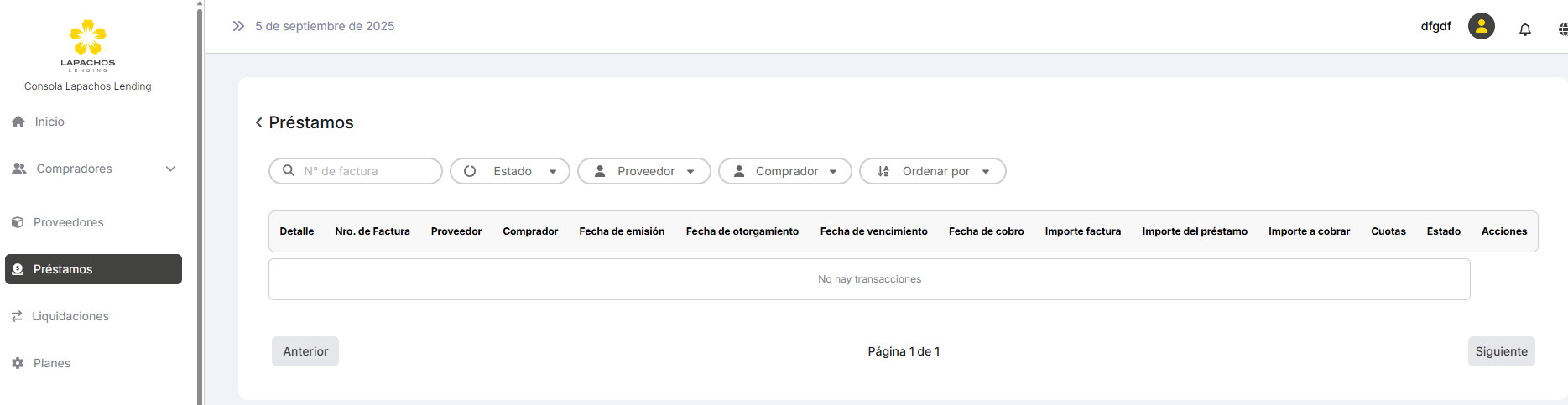 Cuando inicia sesión un Lender por primera vez y no tiene data, en el listado de Prestamos el cuerpo de la tabla no coincide con la cabecera.