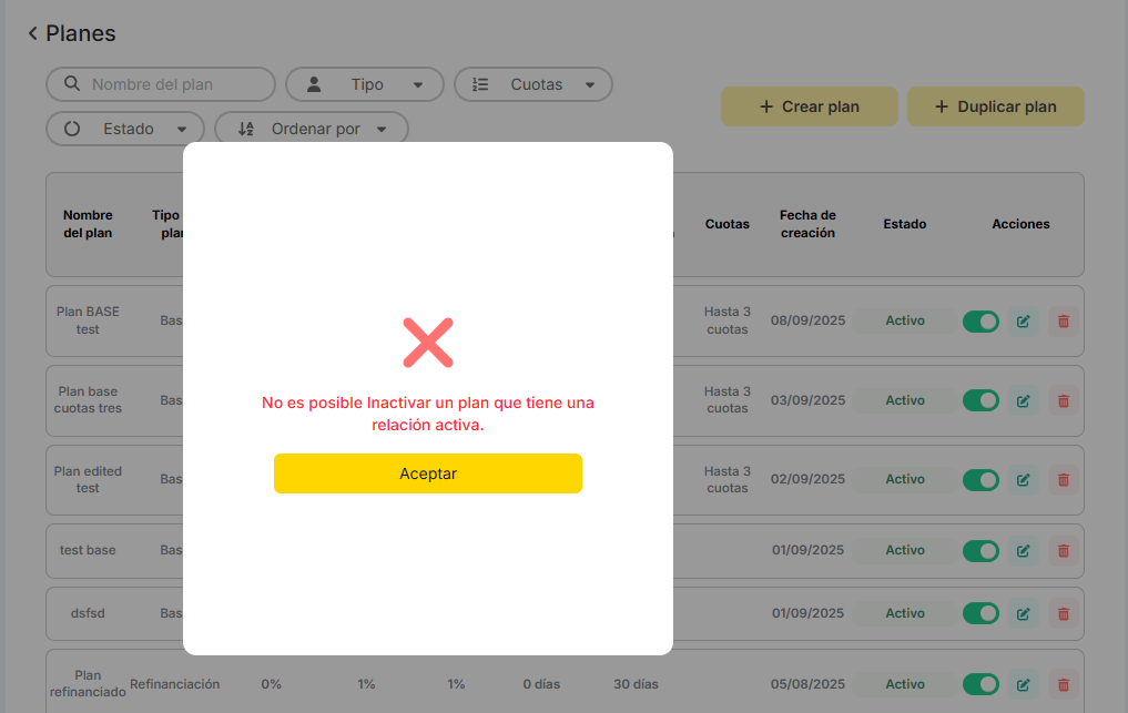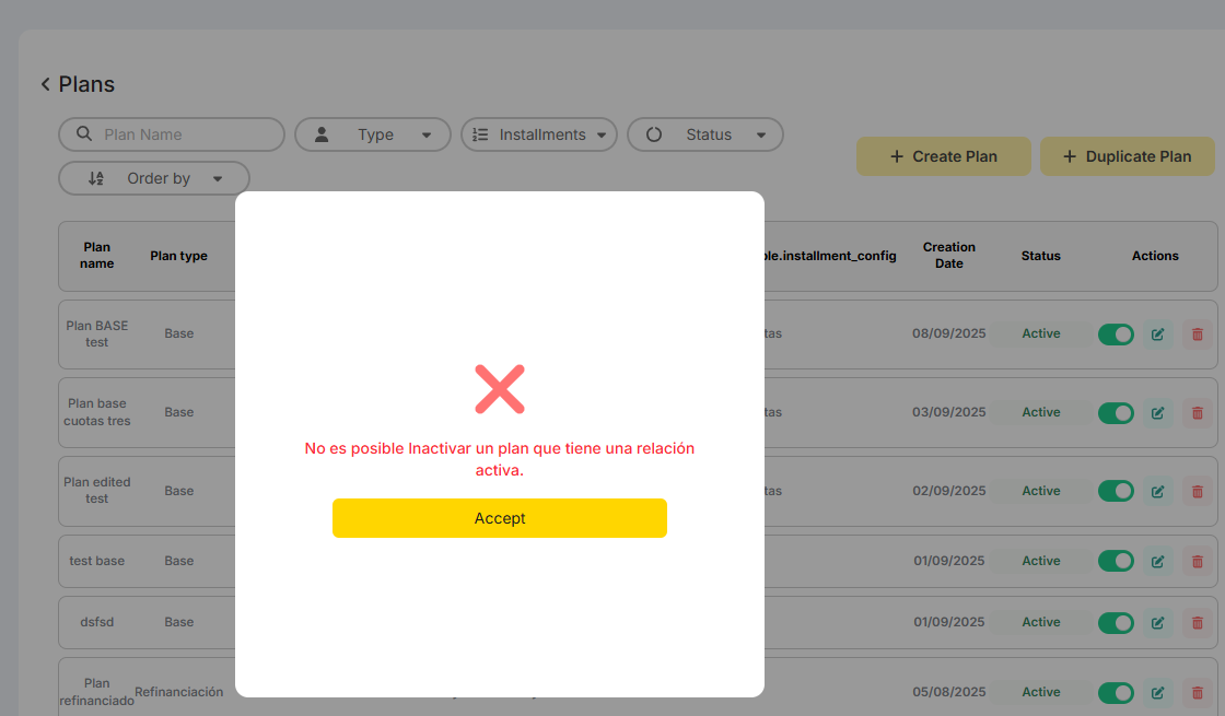Al inactivar un plan que tenia una relación la cual paso a estado baja definitiva, no deja inactivar el plan. Sale el siguiente mensaje de la imagen.