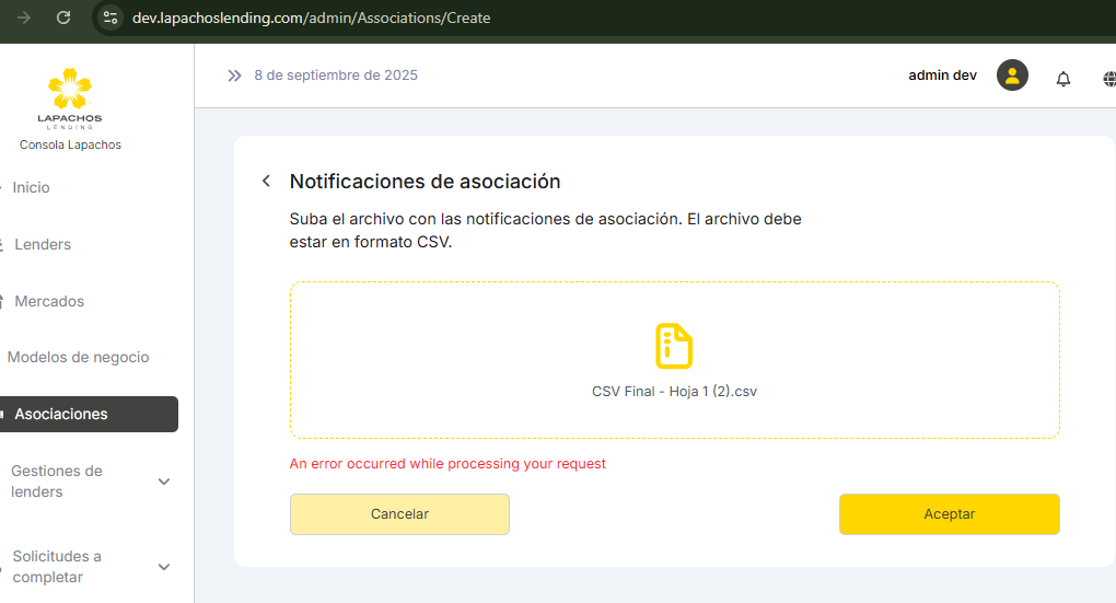 Al dar de alta una asociación muestra un error, el error no da a entender que esta fallando.