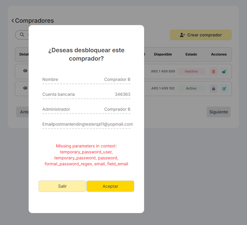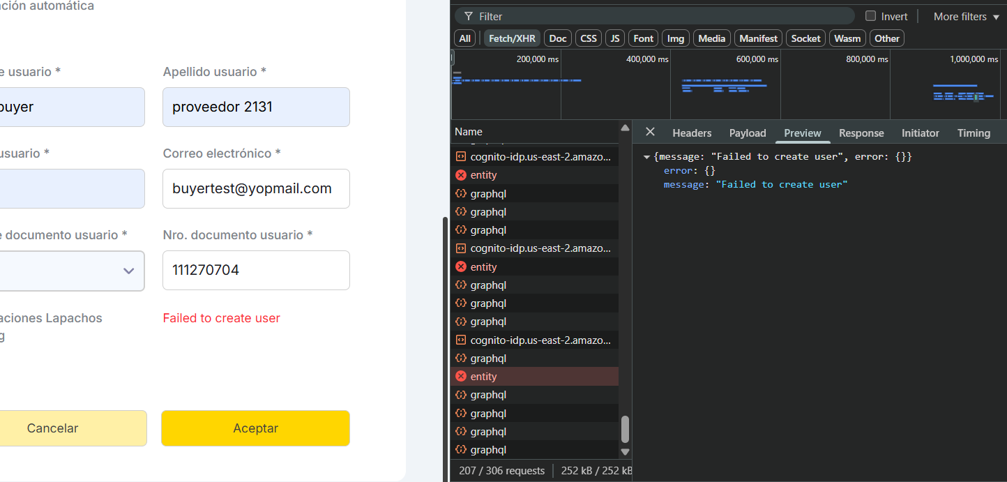 Al crear un comprador, si el correo ya existe, el backend retorna el error con el mensaje “Failed to create user”. Lo más óptimo sería agregar un mensaje más específico acorde al error.