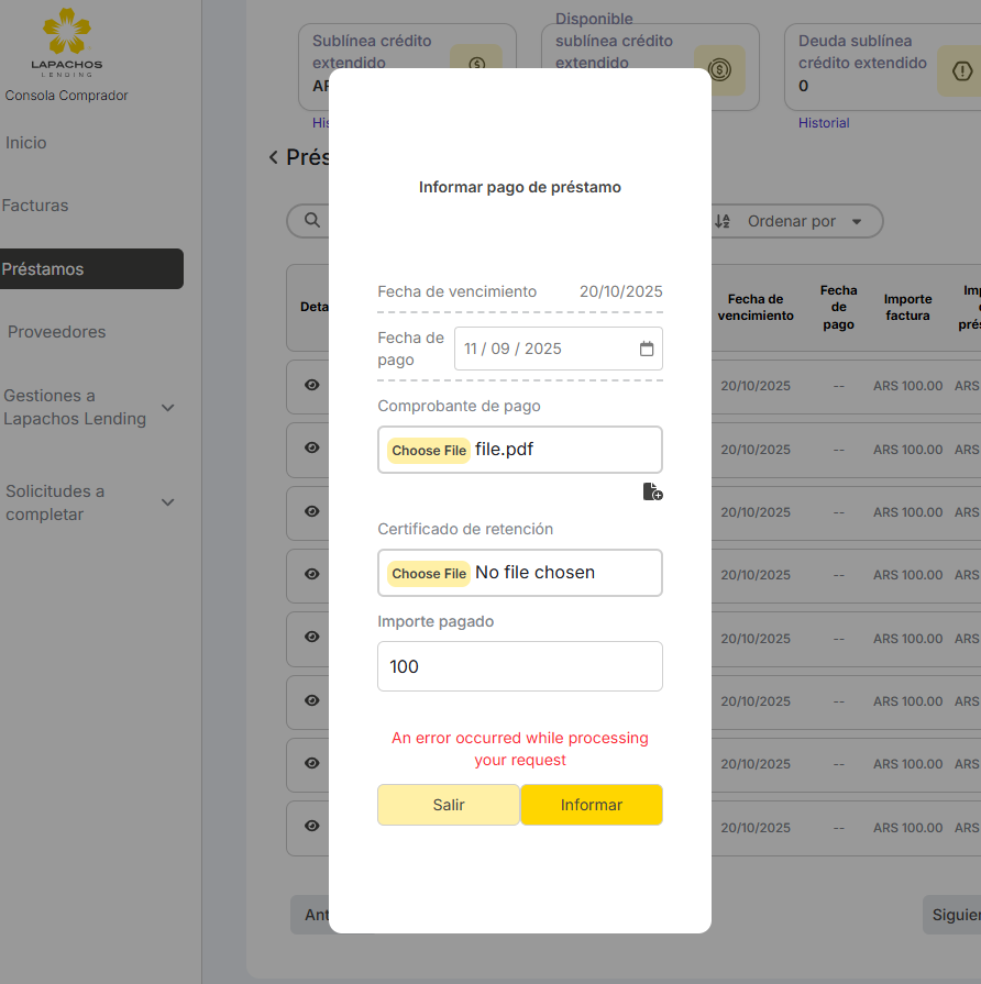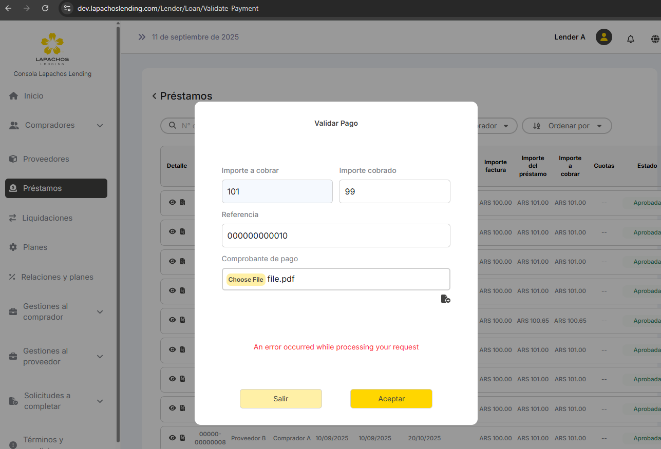 Validar pago desde el Lender retorna error