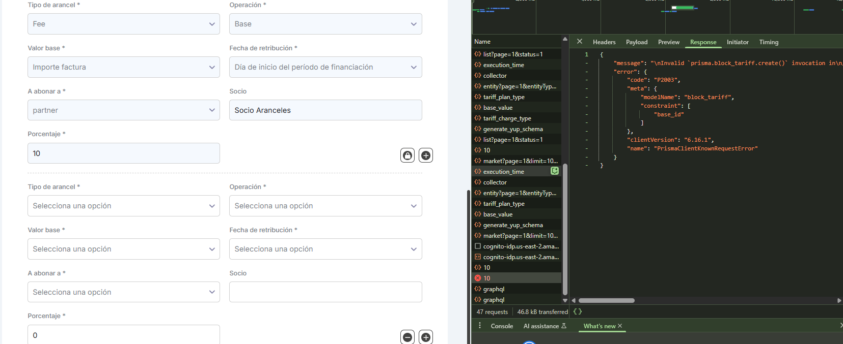 Al editar una asociación cuando se presiona el boton “+” para agregar aranceles pero no se rellena ese formulario, y se presiona “Aceptar” devuelve el error el backend pero en el front no se muestra.