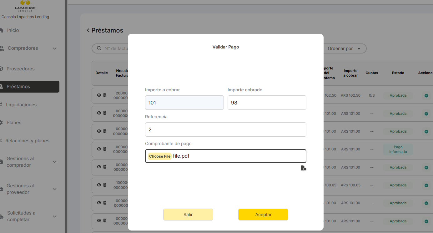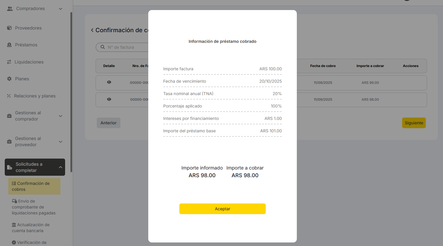 En el listado de solicitudes a completar. El detalle del préstamo, el valor de “Pago a cobrar” no coincide con el valor real. Debería ser 101 para este caso.