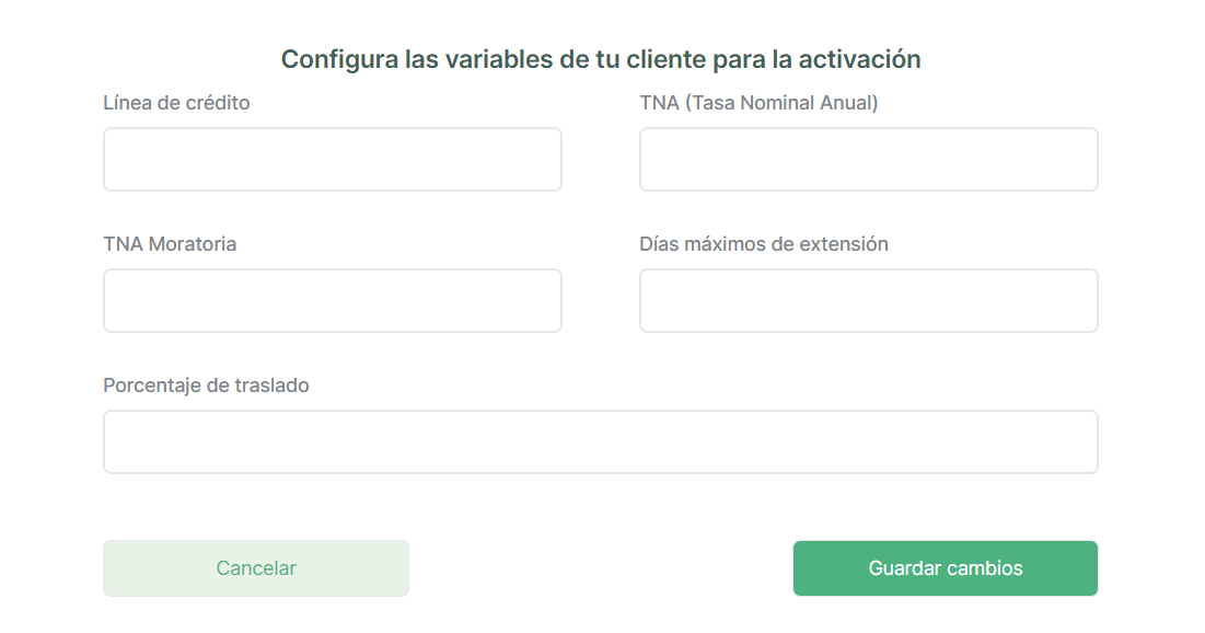 El proceso de definición de variables crediticias particulares, de cada cliente, que ejecuta el Lender para poder activar al cliente seguirá existiendo. Tambien deberá seguir funcionando el flujo para modificar estas variables.