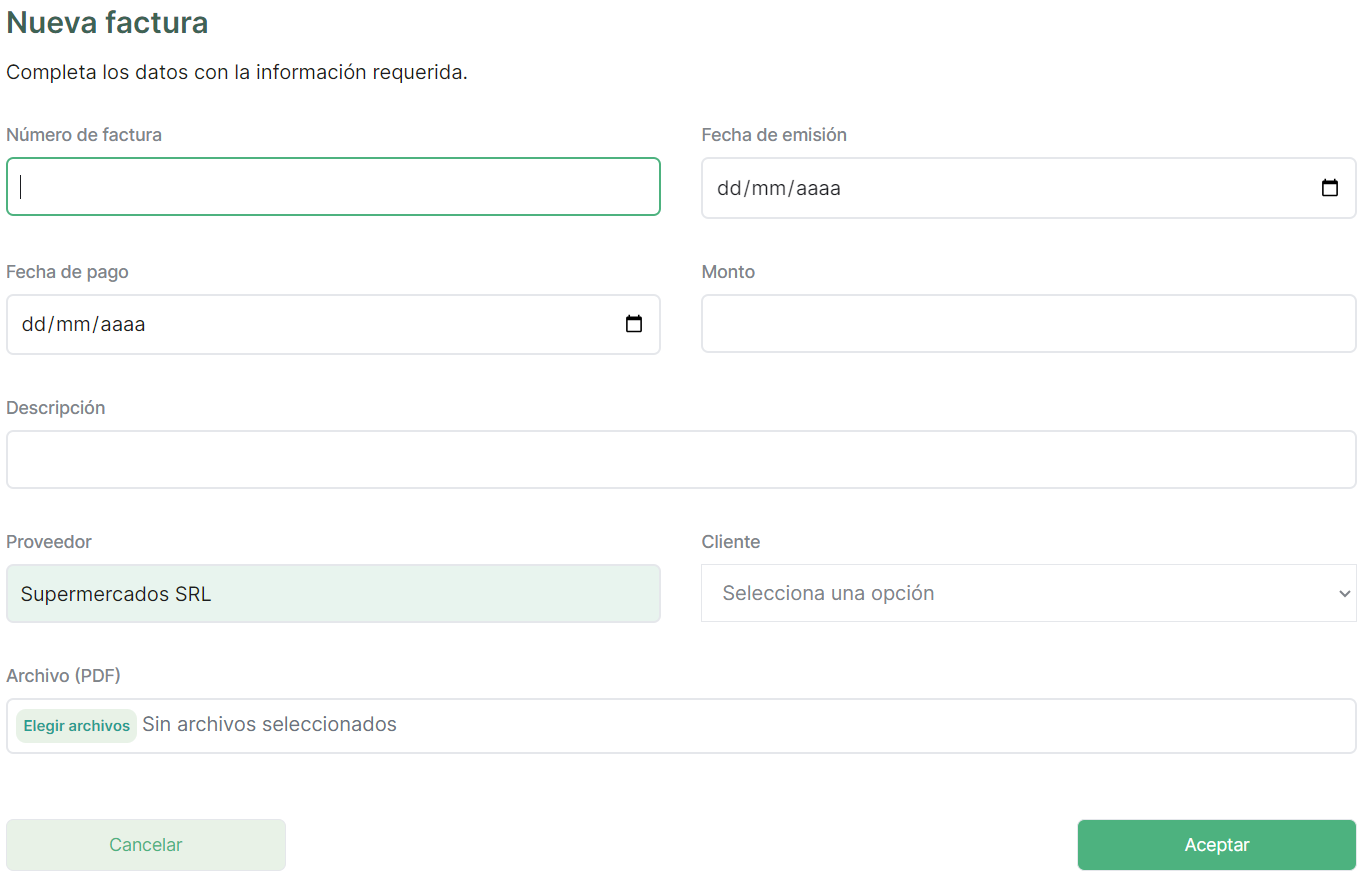 El proceso de creación de una nueva factura será muy similar a lo que tenemos construido en B2FI. Se pide como campos mandatorios el numero de factura, la fecha de emisión, fecha de pago, monto, descripción, proveedor, cliente y archivo adjunto.