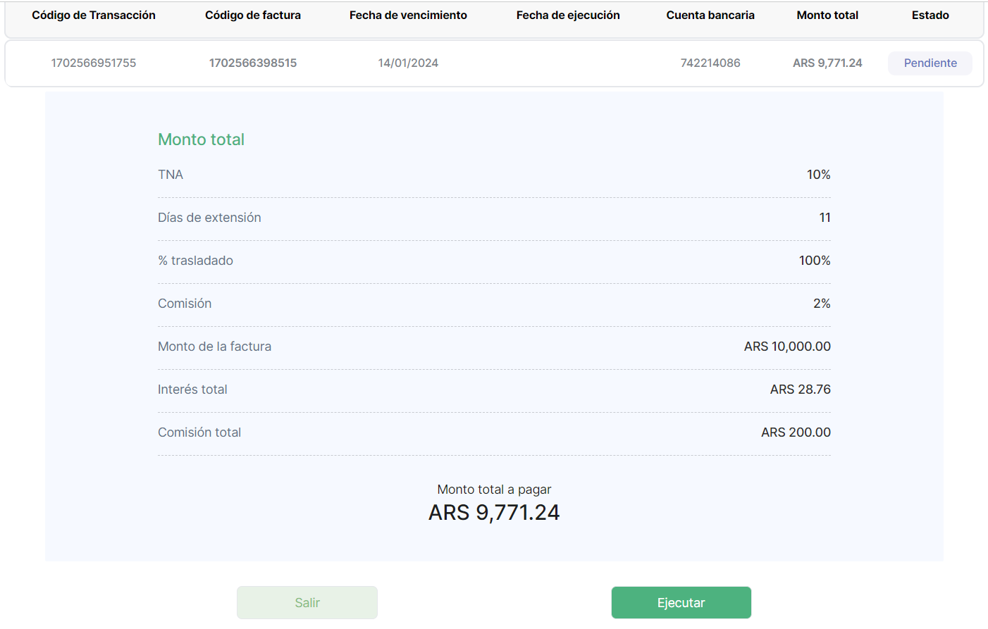 Esta transacción tambien tendrá modificación en cuanto al calculo de total. En la totalidad de los casos el valor de esta deuda será igual al valor total de la factura asociada. Dejaran de existir los termino de interés, comisión e interés moratorio.